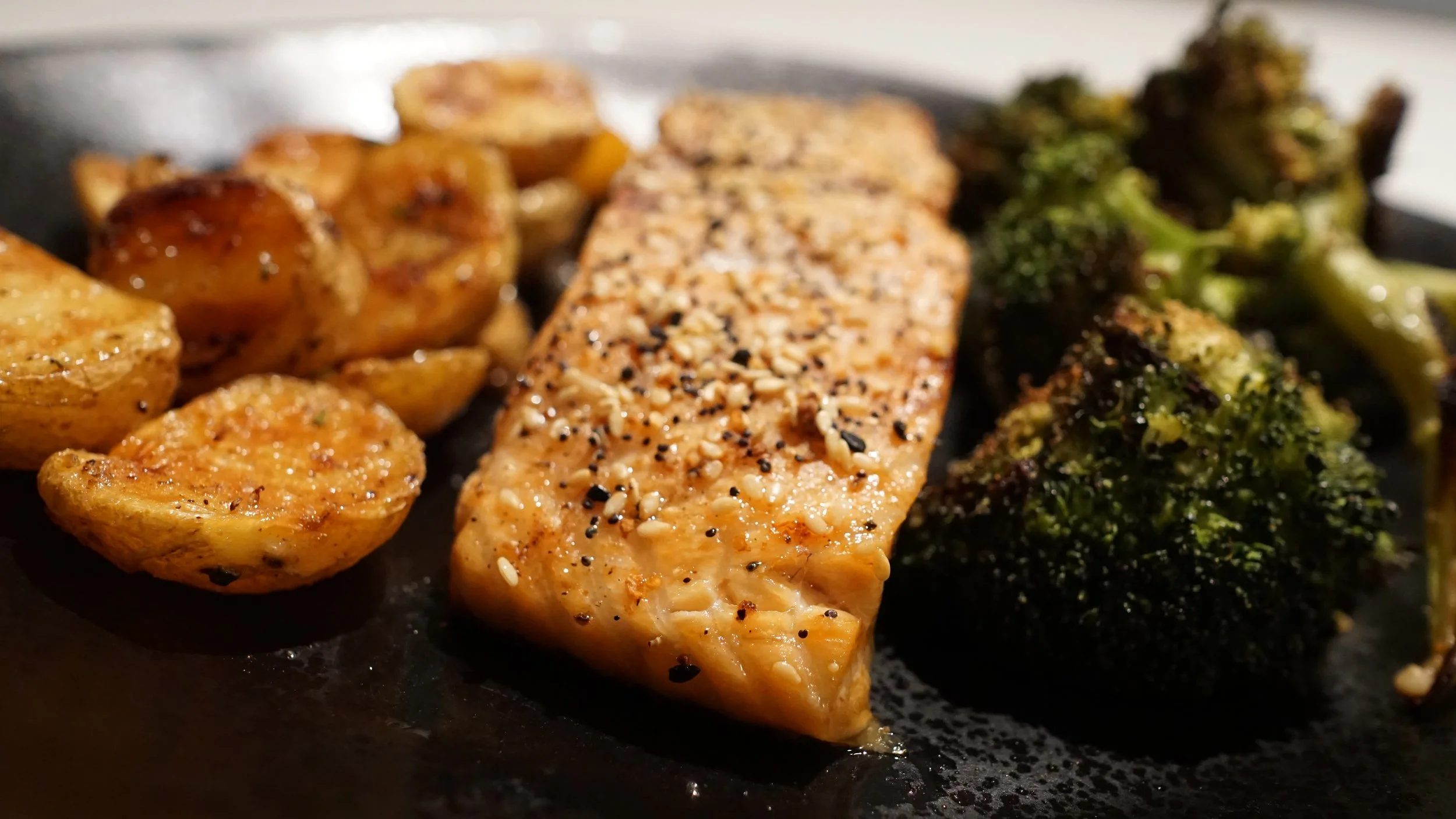 In a small bow add a teaspoon of water to the 1 tbsp of honey mustard (to thin it out) and stir. This mixture will act as a binder for your seasoning. Brush the top (flesh side) of the salmon equally on all pieces with the honey mustard mixture, then season with salt and pepper to taste and the Everything Bagel seasoning. Make sure your cover the entire top of the piece.